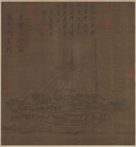 郭忠恕字恕先(宣和畫譜的紀載:字國寶),河南洛陽人。他的性格豪爽,行為放蕩,在文章、篆隸書法及繪畫方面,卻都有很高的造詣。年青時,在後周(951-960)作官,任博士的職務。到了宋朝,曾經當國子主簿,但遭受貶職的處分。他特別擅長於界畫,不但能把樓台殿閣畫得詳細精緻,而且還合乎尺寸比例。這幅畫的船隻,無論是船身、船艙、舵樓、桅桿等,都描繪得非常仔細,各部份的結構也非常嚴謹合理。是研究宋代船隻的最佳參考資料。