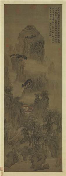 燕文貴(約西元十一世紀),浙江吳興人。少時曾流落京師(河南開封)為商販,後來才華被畫院待詔高益所賞識,得以進入畫院任祇候之職。山水、人物均佳,尤善於描繪四季景物,清雅可愛。畫院中人稱其畫為「燕家景」。本幅寫山峰林立,山谷中煙嵐留滯,似欲描寫山雨初收。澗壑奔流直瀉,小路迴曲,延向山中樓閣,景境幽靜清雅。雖款繫燕文貴,惟畫風較近似晚明。