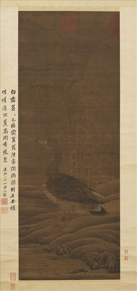 崔白字子西,濠梁(今安徽鳳陽)人,仁宗時(1022-1063)選入畫院為藝學,善畫花鳥,尤其擅長於花竹、山兔、枯荷、水鳧、野雁之類的題材。水濱蘆叢下,有隻孤雁徘徊停留著。雁先以濃淡墨雙鉤成輪廓,然後用水墨漬染,再填以赭色和花青,表現出毛羽豐潤的光澤。絹地染上淡墨,使背景趨於明顯,並有寒氣籠罩的感覺。坡石上有「濠梁崔白」的款字。