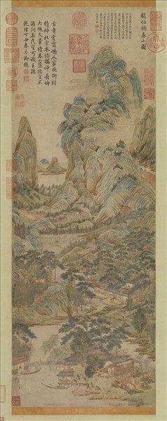 趙伯駒(1120-1183),字千里,宋太祖七世孫。善畫青綠山水,兼工花卉翎毛,尤長於人物樓臺界畫。本幅畫山水晴雲,遊騎尋春,村家桃柳,水亭茶話。通幅以青綠為主調,生動地表現出春日觸目階綠的景緻。