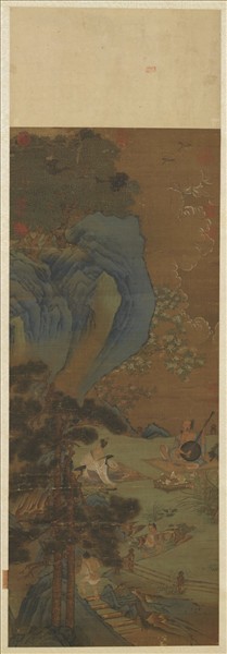 趙伯駒(約1120-1162),字千里。乃宋太祖七世孫。趙令穰之子,官至浙東 兵馬鈐轄。善青綠山水及木石,兼工花卉翎毛,尤長於人物,精神清潤,能別狀貌。本幅寫松石間瓜果堆盤,一人袒衣席地撥阮咸,一人背坐握羽扇傾聽,橫琴於膝,二童子捧壺執卷。人物、配景俱用鉤勒填彩法敬謹寫就,間或輔以胡粉重提、暈染,黑白相映,分外照人眼明。