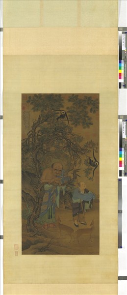 劉松年(西元十二世紀末期至十三世紀初期)淳熙畫院學生,紹熙年待詔。錢塘人,居清波門外,人呼劉清波,又呼暗門劉。山水人物師張敦禮,而神氣清妙,時稱絕品。 劉松年同時所畫羅漢共三幅,此為其中之一幅。畫者倚桫欏樹,上有通臂猿摘石榴,一童持杖,以袂承果。用筆傅彩,皆極精妙,尤以佛頂圓光,及三樹枝柯掩映,繁縟精美,皆臻絕妙。羅漢在早期佛教?,是獨善其身的修行者,大乘佛教興起後,逐漸具備渡化眾生的菩薩特質。本幅畫一羅漢,濃眉高鼻,倚桫欏樹沉思,身側一小和尚以衣袖承接樹上長臂猿所摘之石榴,羅漢的袈裟圖案以泥金描繪,透過他頭後的圓光,尚能看見樹枝掩映,足見畫家功力。斑駁的樹幹和湖石表面,呼應著羅漢佈滿皺紋的面容。 尊者倚桫欏樹。上有通臂猿摘桃,一行童持杖,以袂承之。雙鹿馴遊。款「開禧丁卯(一二○七)劉松年畫」。有「內府書畫」「皇姊圖書」印。按「內府書畫印」凡六見:一見於唐盧楞伽十八羅漢冊(見喜龍仁中國畫第三冊圖八九下),一見於北宋趙令穰橙黃橘綠冊(見本書圖七○);一見於宋高宗書紈扇(為趙令穰橙黃橘綠冊對幅,未印);另三印即見於此三幅羅漢像中。盧楞伽羅漢冊,「內府書書」印鈐於左上角,「皇姊圖書」印鈐於右上角;趙令穰畫及宋高宗書,因係圓幅,「內府書畫」印皆鈐於正中上方。亦無「皇姊圖書」印。此三幅羅漢像,「內府書畫」印,皆鈐於左上方。而「皇姊圖書」印,第一幅鈐於左上方,在「內府書畫」印之下;第二、三兩幅,則鈐於右上方。據此,則知「內府書畫」印,鈐蓋有定位,而「皇姊圖書」印無定位。亦即證知「內府書畫」印在「皇姊圖書」印之前。故「內府書畫」印在時間上之上限為開禧丁卯(一二○七),下限為元貞乙未(一二九五),極可能為宋寧宗收藏印。