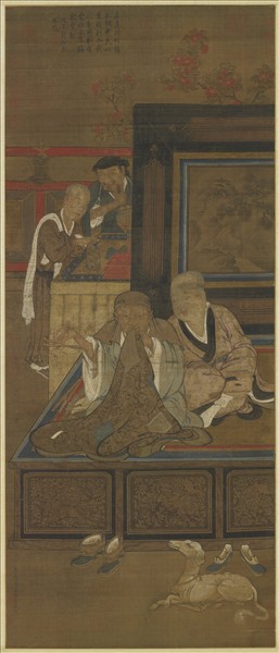 本幅畫兩名僧人坐於禪榻上,老者正潛心補衣,另一人則抱膝旁觀。屏後,復有侍者二人,佇立捻茶。畫中人物,表情鮮活而自然,衣紋用筆亦流暢有力。惟右下方款署之「畫院待詔賜金帶劉松年敬贈」,及鈐「劉松年印」,疑偽。 劉松年(活動於1174-1224),浙江錢塘人,南宋孝宗淳熙間(1174─1189)延入畫院,紹熙間(1190-1194)升為待詔。存世作品以「畫羅漢」三軸最具代表性。若與「補納圖」相較,風格互異,故本幅應係元以後畫家託名而作。