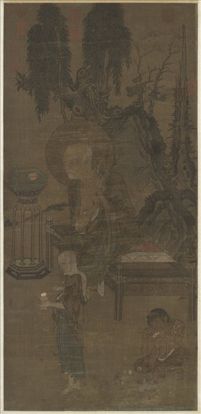 李嵩(西元1190至1230年),錢塘(今浙江杭州)人。李從訓養子,光、寧、理。三朝畫院待詔,工畫道釋人物,得其義父遺意,尤長界畫。  本幅除山石皴筆外,俱用中鋒鉤勒,筆蒼勁而流暢。柳葉藤枝,真力充沛,運轉若神。佛畫中每多佳作,此則其尤者也。
