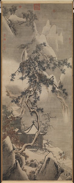 白雪靄靄,一株松樹挺立在畫幅的中央,幾株梅花環繞著屋宇,橋上一人騎馬而行,他的侍從縮著頸子,十分瑟縮的樣子,全畫充滿澈骨的寒意。 本幅下方又有「馬遠」的款署,而且畫中的松枝曲折低垂,勁挺如屈鐵,仍具馬遠拖枝的餘韻,所以過去有人認為這件畫作應出自南宋院畫名家馬遠(活動於西元1190-1224年)之手。可是從此畫的風格和筆法看來,它應該是明代畫家偽託馬遠之名的作品。