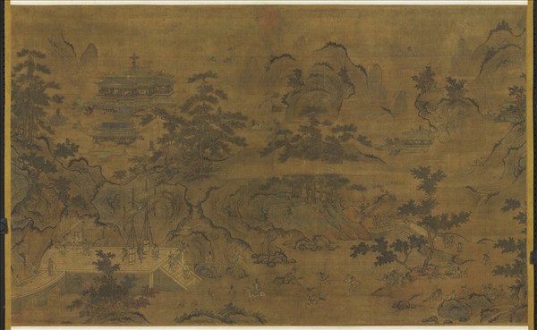 趙大亨(西元十二世紀),時人以其肥偉,號之為趟大漢,自恥其俗,因名大亨。為趙伯駒伯驌兄弟之皂隸,多獲遺稿,且諳其法,遂亦善畫。本幅寫蓬萊仙會,群仙徒騎而至,用筆細膩,描擬盡態。洞府之中,雲上作界畫樓臺,西王母在焉。方寸之中,直欄橫檻,棟宇軒櫺,無不雕金鏤翠,燦然俱備。石上有趙大亨三字款,疑係後加,依畫風當為明代。元代以後,慶壽劇流行,以西王母有蟠桃之壽,眾仙來祝,其中八仙尤不可缺,本幅即是。
