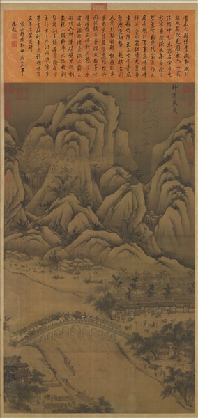寒山雪積,村肆沿溪而設,長橋跨岸,旅人、牛、馬絡繹於途,木筏順流結集,一派趕集景致。遠景幽壑,樓台掩映,寒鴉成陣,匝繞盤旋,通幅於熱鬧中不失雪天陰寒之氣息。屋宇、舟車、拱橋,俱以界筆出之,線條略呈釘頭鼠尾,有別於傳統界畫。近景人物,五官、表情歷歷可辨,愈遠則愈簡,屋宇、林木亦然,深合近大遠小之理。