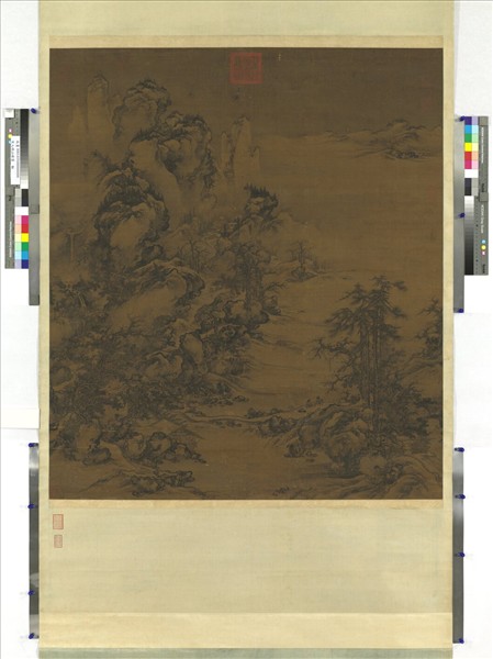 無作者款印。一溪兩岸。岸之右高松卓立,岸之左層山疊起,一徑逶迤。溪 橋、行旅、閣榭、寺宇、婦幼、僧侶點綴其間。飛泉、鳴澗、煙靄,穿插掩映,極見幽深蕭遠。畫筆全仿郭熙早春圖,其嚴謹雄勁,去郭熙不遠。惟主山旁移,主樹增大,或為宋朝南渡後中國北方郭熙一派之中堅。