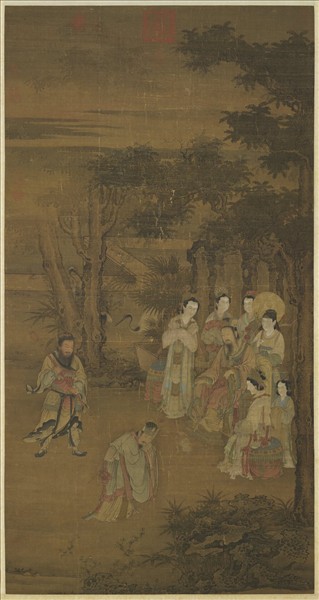 本幅繪漢文帝時爰盎諫止齊寵妃潛坐之故事。文帝遊上林苑,甚夫人潛坐帝旁,爰盎面諫,謂帝既有后,不當容其妃同坐於側,否則尊卑失序,終會禍及慎夫人。 帝納其議,慎夫人亦賜金爰盎。畫中坐花園一角,雲霧掩映,樹石包圍間,爰盎正直言相諫,慎夫人怒,不願就坐,文帝則端凝傾聽,圖像之表現亦在強調皇帝虛心納諫的典範。幅上無名款,人物線條流利簡潔,樹石刻劃精謹,為南宋院畫佳作。 漢書爰盎傳記載著:有一天,皇帝駕臨上林苑,皇后和慎夫人也追隨同往。平時在宮裡,皇帝和慎夫人都坐在平等的座席,這一天,爰盎卻引慎夫人坐於次席。慎夫人很生氣不肯就座,皇帝也很生氣。爰盎立刻上前解說道:「臣聽說尊卑有序,上下才能和睦。現在陛下立了皇后,慎夫人就是妾位。妾和主人怎可同坐?現在陛下衞護著慎夫人,卻正是害了她。陛下難道不知戚夫人的事嗎?」這張圖就是描繪這一段故事。