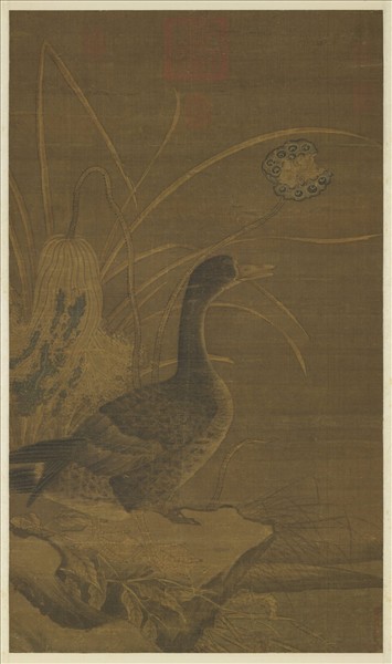 水邊一石突起,野雁昂首蹣跚而下,其神真摯。石上紅蓼,踐於足下,背作殘荷敗葉與蓮蓬,秋意甚濃。雁以雙鈎為之,多用墨染,略加赭石與花青;其餘亦多雙鈎填彩,畫草近似沒骨,皆極精謹而生動。