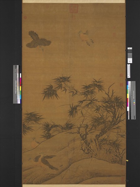 坡石上茅葉荊棘小竹叢生。霜後郊原,半歸枯搞。斑鳩五隻,飛者如聞鼓翼之聲,行者則神態安閒,怡然自得。通幅筆墨,勁挺中甚為樸質,大率宋人花鳥畫,法度精嚴,形似逼肖,筆墨工整中,不失天機物趣,由此畫足見一斑。