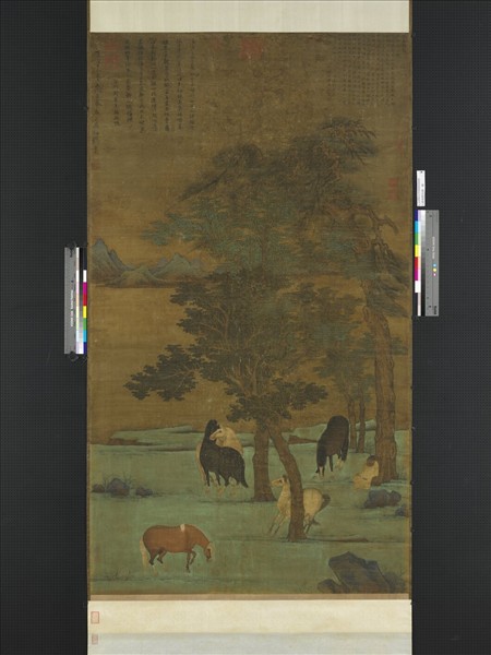 趙雍,字仲穆,趙孟頫之子,生於至元二十七年(1290),或作至元二十六年,卒年待考。官至集賢待制。書畫出自家傳,善山水,尤精人馬及竹石。 水濱疏林,駿馬五匹散遊其間,圉人倚松假寐,狀極悠閒消遙。馬匹肥壯,設色以青綠為之,樹葉之表現近圖案方式,饒古拙之趣,頗有唐人遺意。畫中山水份量極重,構景空闊而幽遠。