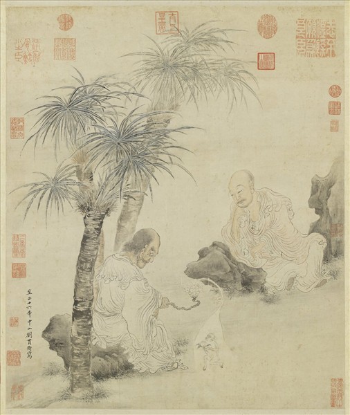 劉貫道(約活動於西元一二七O-一三OO年),字仲賢,中山(今河北定縣)人。善畫,寫御容稱旨,補御局使。道釋、人物悉宗晉唐古法。山水宗郭熙,花竹鳥獸亦能集諸家之長。 一羅漢正顯神通,杖上蓮花化出一靈猴獻桃,另一羅漢倚石而觀。人物衣褶結構疏散,筆筆間銜接不很緊密,但意趣已足。設色淺淡,有清雅脫俗之致。畫上有至正十六(西元一三五六)年款,惟劉氏活動年代似未遲至該年。