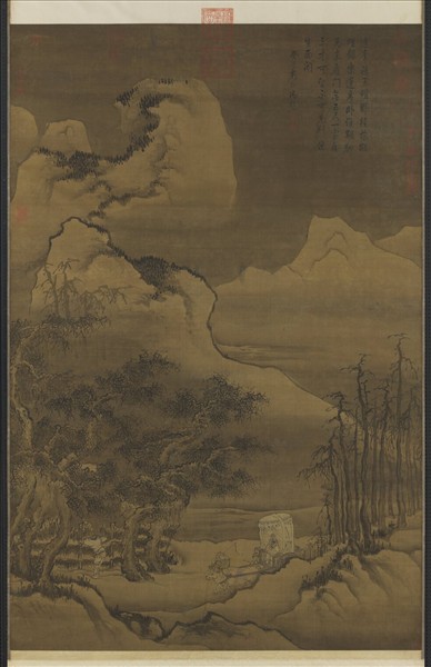 袁安,東漢汝南人。洛陽大雪,積地丈餘,洛陽令出巡,見人皆除雪出,至袁安處,雪深不見路,或謂安已死。令命人除雪出戶,見安僵臥,問何以不出,安曰:大雪,人皆餓,不宜干人。令以為賢,舉為孝廉。本幅繪寒林蕭索、積雪封山,太守乘車來訪,隨侍先叩柴關,似突出在位者訪才招賢之寓意。畫中用筆快速,樹石以墨染暈刷而成,人物衣紋則勁健多折,雖題為顏輝,風格不類,應乃後人所作。
