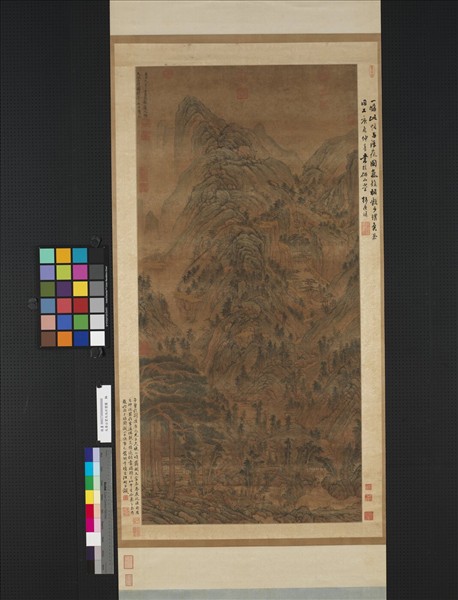 黃公望(西元一二六九至一三五四年),字子久,又號大癡道人,晚號井西道人,浙江富陽人。畫山水遠師五代的董源,成就極高,是元四大家之首,對明清畫家有很大的影響。 山脈連綿不斷,蒼翠的草木漫山生長。山脈兩側,一面為溪水曲折穿流,一面烘染煙雲,不見山腳,頓覺滿紙千巖萬壑。按畫中年款,是七十三歲(西元一三四一年)時的作品。