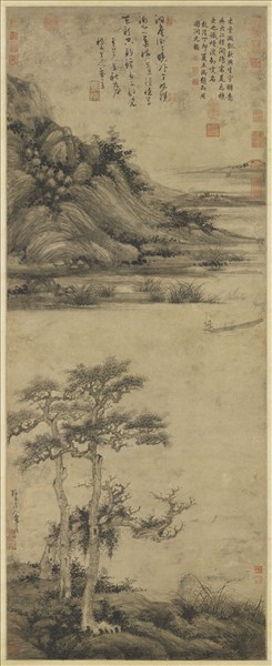 吳鎮(西元一二八○—一三五四年),浙江嘉興人。善畫山水花竹,與黃公望、倪瓚、王蒙,被合稱為元代的四大畫家。 本幅是吳鎮六十二歲的作品,採用「一河兩岸」式的構圖,近景畫雙松挺立,枯樹橫斜,隔岸則是迤邐的山坡,與水邊蕩槳的漁舟,十分忠實地呈現出江南水鄉澤國的景象。雖然布局簡略,但添加邊角的簽名,以及上方的題詞之後,別具一番寧靜典雅的情調。