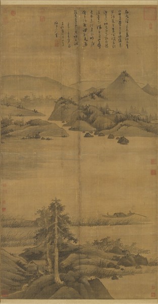 吳鎮(1280-1354),嘉興人,字仲圭,號梅花道人,又嘗自署梅沙彌。畫師巨然,而能自闢畦逕,是元四大家之一。 本幅前景兩棵樹,下方有一路亭。對岸丘陵起伏,湖山蕩漾,漁父歸舟。用筆不多卻表現了深遠寧靜的大自然,今人心嚮往之。