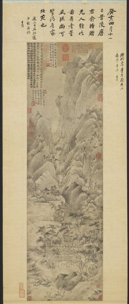 王蒙(西元一三0八─一三八五年),吳興人。字叔明,號黃鶴山樵。趙孟頫外孫,畫得趙氏法,而能自成面目,為元四大家之一。 本幅係山樵學董源之作。畫樹用筆,極其靈動;畫山用筆,極其靜穆。通幅雅韻宜人,極靈秀之能事矣。 王蒙(西元一三0八-一三八五年),浙江吳興人。趙孟頫外孫,自號黃鶴山樵。與黃公望、倪瓚、吳鎮並列元四大家。 畫中描繪崇山峻嶺中的谷口田疇,山石用董巨皴法,但構圖已不似他早期作品般保守穩定,畫家正嘗試在狹長畫幅中追求堆疊組合的變化。不過,皴法尚未發展為扭曲蠕動的牛毛皴,空間結構也還未大膽的從自然景象中解構,應該是早於〈青卞隱居圖〉的四十至五十歲間的重要作品。