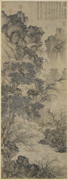 王蒙(西元一三○八—一三八五年),吳興(浙江湖州)人。字叔明,號黃鶴山樵,趙孟頫外孫。畫風以王維、董、巨為宗,但能自立面目,為元四大家之一。 本幅寫陶潛〈桃花源記〉之景色。春光明媚,漁郎撐棹,徐行於江水之上。兩岸桃花齊綻吐英,遠山疊嶂,山頭苔點繁密,為一煥發回春的景象。此作山石、樹木層疊,構圖繁複,無迫塞之感。皴山畫樹,層層點染,筆墨蒼潤,有古雅之趣。