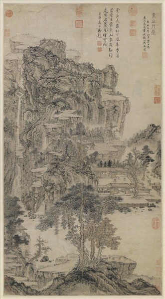 王蒙(西元一三○八至一三八五年),字叔明,號黃鶴山樵,吳興人。趙孟頫外孫,畫得趙氏法,而能自立面目,為元四大家之一。 此係山樵三十六歲(一三四三)作隔水茆堂,背山重疊,磊石、布屋、開湖,形制皆偏向於方。通幅用筆,皆切實而穩厚。雖樹幹鉤籐,山間苔點,極細微處,均無輕蹤之筆,故別有一種穩重蒼鬱意象。後人中如沈周,得力於此者甚多。