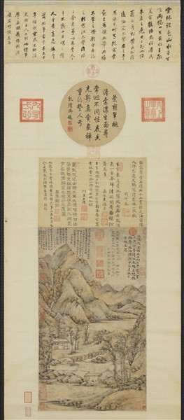倪瓚(西元一三○一—一三七四年),江蘇無鍚人。他的個性孤高,並有很深的潔癖,四十歲以後,便棄家外出,過著漂泊的生活。作畫不喜用色彩,別有一種清淡雅逸的韻味。 這幅淺設色山水,是故宮收藏倪瓚作品中,唯一的一件著色畫。構圖比起他尋常多留空白的習慣,要複雜許多,加上自己的題字,和別人寫的跋語,幾乎把全幅填滿了,確實是倪瓚風格裡難得的特例。
