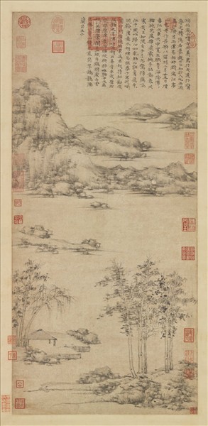 倪瓚(西元一三0一—一三七四年),江蘇無鍚人。字元鎮,號雲林,迂翁。家富饒,築清閟閣,蓄古書畫。善山水,為元四大家之一。 秋林蕭瑟,坡岸縱橫,構景若星羅棋布,用筆用墨,渾然天成,但覺作畫之時,點擦皴染,筆筆若不相涉,而既成之後,則呼應靈動,關合甚嚴,所謂信手拈來,都成妙諦也,是雲林老年精品。七十二歲畫。