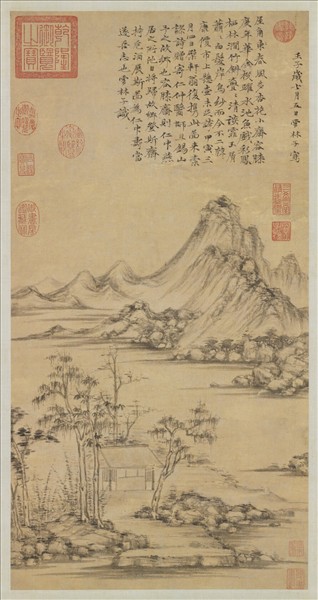 倪瓚(西元一三0一—一三七四年),江蘇吳鍚人。字元鎮,號雲林、迂翁。家富饒,築清閟閣,蓄古書畫,尤善山水,為元四大家之一。 水墨畫河岸、疏樹、竹林與房舍,對岸則山巒起伏。用筆多中鋒,山石皴法以披麻為主,略有折帶筆意。幅上有壬子(一三七二)年款,時七十二歲。然本幅題款,實摹自本院藏倪氏真本「容膝齊圖」。用筆亦無倪氏一代大家之健勁,顯係後代摹品。