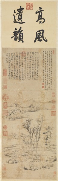 倪瓚字元鎮,號雲林,江蘇無鍚人,生於元成宗大德五年(西元一三 0 一),死於明太祖洪武七年(西元一三七四)。他的人品清廉,有特別好潔的怪癖。家裹相當富有,但他對於金錢非常淡泊,不喜歡理財。晚年甚至把家產分送親友,然後駕著小船和鄉野的漁夫隱士往來。 雲林的山水具有特殊的風格,構圖常作一河兩岸的取景,畫中樹石的安排都很簡單,而且畫面很少塗抹顏色,有著簡樸、天真淡雅的韻味。