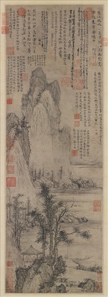 王紱,江蘇無錫人,早年曾接受從仕的教育,由於具有文學才能,又擅長書法與繪畫,在明成祖永樂朝文淵閣任職,仕至中書舍人。他喜好代表文人品味的墨竹與寫意山水畫,兼具職業畫家的技巧與士人畫的特質。平日作畫隨性而為,但是他品性高潔,不隨意為人作畫。這幅畫的構圖單純,近景平坡水岸,樹石間三位官員聚在亭子裡宴飲,背景則是兩重高聳的山峰。畫面上端的空白處,題了十三首詩,內容都是圍繞在表達離別的情意,作詩者大都是與王紱同在翰林院任職的官員。從詩意看,可知是在秋天時節,一位同僚即將離職,回到松江的家鄉,享受有山水為伴的退隱生活,王紱作了這幅半具象的山水畫,同事們則各題一詩做紀念,是明代盛行的送別圖的典型例子。受畫的對象或參與題詩者,都是有文藝修養的文士,王紱的畫也能表現出元代以來,以簡單的水墨畫法,表達有畫外深意的文人畫作風。山石平穩堆疊,岩石表面扭動交錯的皴擦紋理,令人感受到平靜中又帶著些許蒼涼與感傷。(何傳馨)