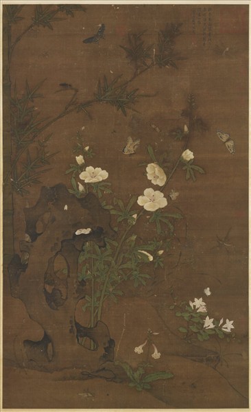 商祚,河南濮陽人。他是名畫家商喜(十五世紀)的孫子,畫風亦傳承自祖父。本幅畫坡陀上,挺立著一塊造型古雅的太湖石,秋葵、翠竹和野花參差地排列在後,天空中、枝稍和地上,還飛走著各色蝴蝶、鳳蝶、蛾、胡蜂、天牛、蚱蜢,和蝗蟲,整件作品,飄散著濃郁的秋意。畫中主景,大多被安排在右半邊,用筆與著色,也極其沉穩厚重。這些特質,都屬於明代院畫中典型的面貌。