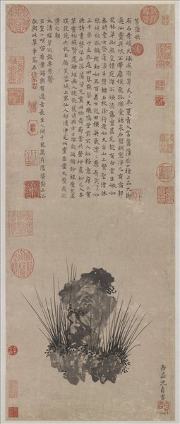 沈貞(西元一四00─一四八二年尚在),澄子,沈周伯父。字貞吉,號南齋,又號陶然道人,以字行。工詩兼善繪事。賦一詩,營一幛,必累月閱歲乃出,故畫不妄作,而流傳亦少。 此幅畫一石,上植菖蒲數莖,雖寥寥幾筆,而皆勁挺穩重,營置亦嚴,非出於倉卒間者。