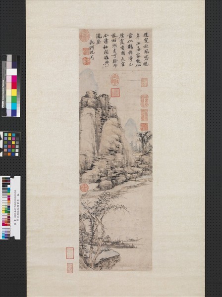 此幅紙有六橫折,蓋用摺紙所畫,一時遣興之作。題詩詠弔倪瓚,畫亦仿倪,與策杖圖相較,皴山之筆稍肥,略近成化丙申(一四七六)所作山水。樹法亦不同倪瓚,略似贈劉珏之「米不米,黃不黃」山水小軸。款書學蘇,與吳寬頗近。畫無年款,亦不能歸定於一時,疑作於成化丁亥(一四六七)至丙申(一四七六)間,沈周四十歲至五十歲。