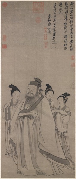 郭詡(西元一四五六-一五二六年),江西泰和人。字仁宏,號清狂。善山水,作畫不依畫譜,取法自然。與同時之吳偉、杜堇、沈周以畫論交,天下競傳清狂之畫名。弘治中,徵天下善畫者,應召至京師。後以寧王之亂,辭謝寧王宸濠之召納,往依王守仁。  清狂於山水外,又喜雜畫,信手作人物,輒有奇趣。此幅畫謝安攜妓遊東山。謝安(三二0-三八五年)為東晉孝武帝時人,曾敗前秦符堅兵於淝水,因是知名。