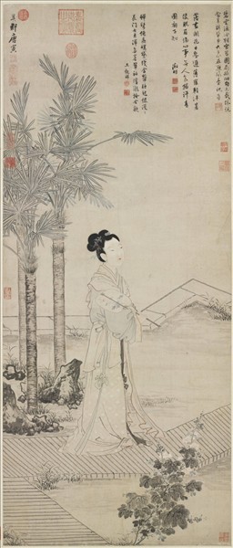 本幅取材自漢班婕妤的〈怨歌行〉:「常恐秋節至,涼飆奪炎熱,棄捐篋笥中,恩情中道絕。」櫚樹下,班姬持扇佇立,庭前復植有蜀葵,點出夏末時令。 幅中畫花用沒骨法、仕女臉部的三白法,均與杜菫「玩古圖」極近,據此可觀測唐寅的風格源流。另外,由畫上方文徵明題識的書體研判,應為文氏四十歲後所作。文與唐同年,故本幅可定為唐寅此際(一五○九頃)的作品。