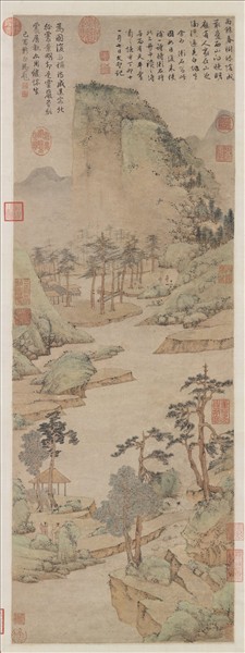 文徵明(西元一四七○至一五五九年),江蘇長洲人。初名壁,字徵明,後以字行。亦字徵仲,號停雲生、衡山居士。詩文書畫並佳,畫師沈周,為明四大家之一。  緣溪坡陀疊起,平岸參差。遠處一峰聳然,頂平而壁峭。其下松林,隱約在淡煙中,蓋寫雨後之景也。筆極細緻,畫樹之筆頗有稚弱者。徵明早年畫蹟不多,蓋晚成者也。款署丁卯(一五○七)十一月七日,畫時三十八歲。