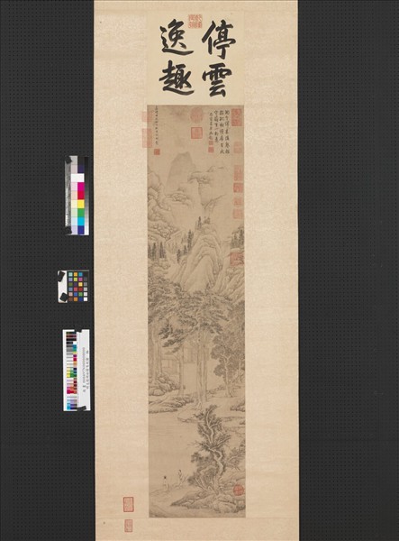 文徵明(西元一四七○至一五五九年),江蘇長洲人。本名文壁,字徵明,後以字行,亦字徵仲,別號停雲生、衡山居士。詩文書畫造詣均佳,與沈周、唐寅、仇英共稱為「明四大家」。  水墨畫山泉林屋,沿溪邊有長松數株,蒼秀矗立。士人二閑步而來,倚杖者行於前。後有山壁瀑泉,遠樹人家,層層推遠。此幀皴山畫樹皆用中鋒細筆,精工綿密而不瑣碎。畫成於嘉靖甲辰(一五四四),是年徵明七十五歲。