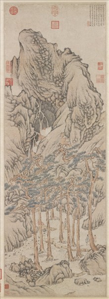 四月十日成此圖,題云:「余留京師,每憶古松流水之間,神情渺然。丁亥(一五二七)歸老吳中,與履吉話之,遂為寫此。屢作屢輟,迄今辛卯,凡五易寒暑始就‥‥」。按履吉,即王寵也。徵明為王寵(兄守)兄弟作畫,皆極著意,與王兄弟契好甚篤。此圖用筆細緻,頗近丙子(一五一六)所畫綠陰草堂圖軸,而筆意時有刻滯處。