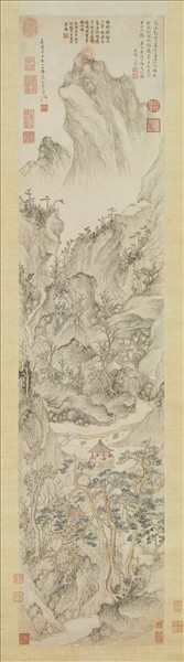 文伯仁(西元一五○二-一五七五年),長洲(江蘇蘇州)人。文徵明從子,字德承,號五峰,又號葆生、攝山老農。善畫山水人物,學王蒙而不失家法。   此畫作於嘉靖甲子(一五六四),時作者六十三歲。六十九歲再題詩,松岡竹塢,蓋詩中語也。溪山深邃,林巒重疊,筆墨以雅澹見長。