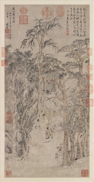 錢穀(西元一五○八-一五七八年),字叔寶,自號磬室。此圖繪於隆慶四年(一五七0),記錄與友人於無錫惠山汲泉煮茗雅事。一小僕人汲圓池惠泉,另二人松下煽火備茶。 惠山泉甘冽可口,自被唐代陸羽評為「天下第二泉」以來,聲名不絕,之後宋代蔡襄、蘇軾等都品嚐過惠泉水,宋徽宗還把惠泉列入貢品。明代居蘇州文人常聚此地賞泉烹茶,作詩繪畫。