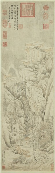 陸治是明代中期蘇州地區的書畫家,生於蘇州包山梅梁里,也在蘇州地區成長。年輕時陸治便喜愛書畫,從自學臨摹入手,後來得到文徵明(1470-1559)的指引,逐步深入,對元代倪瓚、王蒙的畫法漸有心得。五十歲左右,陸治隱居支硎山,園藝工作之餘,靜心作畫,終於進一步畫出屬於自己的格調。 陸治不但擅長山水、花鳥畫,也能作詩文,有詩文集《陸包山遺稿》流傳下來,他的才華可以從這幅雪景探知一二。此時陸治二十九歲,尚在多方面學習的階段,一層層向上積叠的山脈,參考文徵明的構圖方式;綿密的筆法,則與王蒙的用筆較為接近。他用赭墨輕染山石,又用花青點染林木,色調清雅,將寒冬時節學子讀書的情景,烘托出寧謐的感覺。(王競雄)