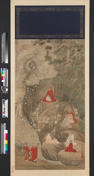 吳彬(活動於西元十六世紀中期),莆田人。萬曆間以書畫擅名,所作人物花鳥山水,皆一意創新,不為古人所囿,往往出奇以自立門戶。  此幅畫水際山崖,六羅漢散坐石上,岸邊兩人仰看天空飛龍舞躍雲端。人物、花樹、山石,描繪筆墨精於其它作品,設色雅靜,渾厚古拙中饒富奇逸之氣。足堪與丁雲鵬互通鼻息。