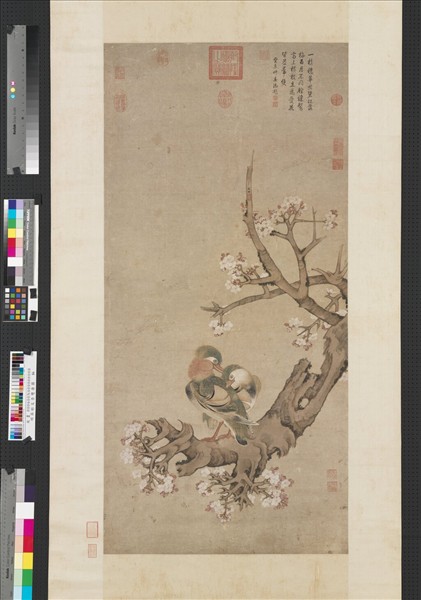 吳彬(活動於西元十六世紀中期),莆田人,流寓金陵,字文仲,一作文中。萬曆間以書畫擅名,所作人物花鳥山水,皆一意創新,不為古人所囿,往往出奇以自立門戶。  此幅畫老杏橫枝雙鴛鴦並立其上,鴛鴦本為水鳥,故甚少畫作棲枝之景。一枝上挑中折,即在折斷處署吳彬二字款,下鈐雙印,佈置富奇趣。通幅筆墨傅彩,皆甚古厚,而又自饒新意。