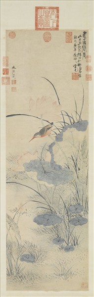 文從簡(西元一五七四-一六四八年),江蘇長洲人。為文徵明曾孫,字彥可,號枕烟老人。崇禎間考取貢生,明亡,入清不仕。書畫皆傳家學,而稍加變化。書法兼有唐李邕,畫法兼有元倪瓚、王蒙筆法。本幅畫荷塘清夏,紅蓮盛開。翠鳥停於蓮梗。畫有勾勒、沒骨兩種方法,此幅可屬後者。設色則以青蓮紅花相映,雅淡之極。用筆亦婉約,一派幽雅。題詩「水面聞香」,可謂恰當。