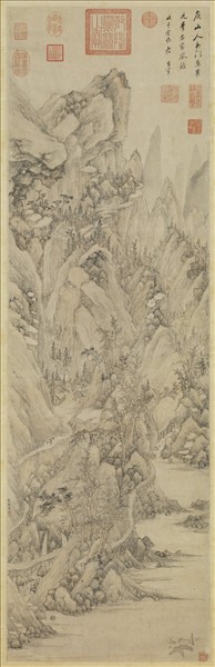 侯懋功(生卒年不詳),嘉靖、萬曆(西元一五二二至一六二○年)年間吳縣(江蘇蘇州)人。字延賞,號夷門。山水師錢穀,受法於文徵明,後宗黃公望、王蒙,入元人之格,為世所珍。   本幅畫溪澗岡巒,山徑、棧道蜿蜒,上通村舍。幅上董其昌題云:「侯山人夷門畫有元季名家風致,此其合作者」。指此不但為侯氏佳作,且有黃公望、王蒙之遺意。若就其構圖與山石樹木之造型、用筆觀之,仍顯見文徵明之影響。