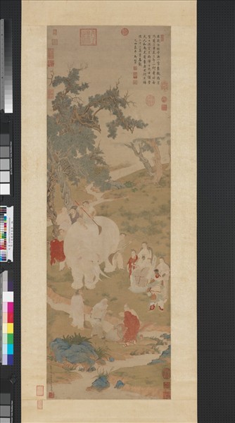 丁雲鵬,字南羽,號聖華居士,安徽休寧人。自幼受父影響,喜愛繪畫,及長拜詹景鳳為師。詩畫俱佳,董其昌遂以摩詰相擬。道釋人物畫是他的特長,為晚明極重要的人物畫代表畫家。本幅畫白象立於盤曲糾結的老樹下,大士坐觀二名童子手持掃帚為之清洗,諸天神、羅漢等環侍左右。人物畫得非常工細,鬚眉毫髮亦絲絲入微,筆筆遒勁。一彎流水呈「S」形自畫面蜿蜒穿流而過,白象與其它兩組人物恰成三角形勢, 再加上點綴的樹石流水,布局疏密有致,敷色鮮豔,整幅畫頗具典麗古雅的意味。禪宗主張破除一切名相的執著,稱為掃相,「相」、「象」同音,畫師作畫大象由人用掃帚掃之,題為掃象圖。丁氏身為佛門弟子,薰冶既深,對於佛理、釋畫均見識深廣,因繪之也。此畫成於萬曆戊子年,當時作者年四十二, 可算是他壯年期的代表作之一。(陳階晉)