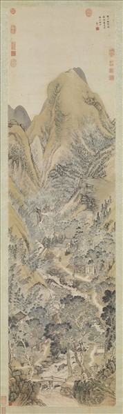 張宏(1577-1668年後),字君度,號鶴澗。江蘇蘇州人。工畫山水,用短促的筆法和濕潤的墨色畫山石樹木,風格獨具特色,構圖也常有新意。此外他也擅長人物寫真。岡巒挺立,層層起伏;溪澗湍急,林陰茂密。山徑蜿蜒而上,將峻峰林木連成一氣。點畫竹林,筆墨濃淡乾濕相間,產生光影浮動的效果,表現出炎炎夏日的氣氛。畫成於萬曆四十一年(1613),時作者三十七歲。青壯之年,筆墨即甚為純熟,其成就為時人所推崇。此圖是畫位在浙江省長興縣境的石屑山,出於實景觀照,畫家心領意會,取山川精華,以靈動的筆墨描繪圖成。本幅畫贈君俞先生,君俞姓唐,晉陵人(江蘇武進),與董其昌也有交往,在天啟三年(1623)時,將自己珍藏的王蒙〈谷口春耕〉圖(此圖現藏本院),贈與董其昌。(許郭璜)