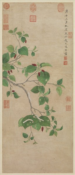 文俶(西元一五九五—一六三四年),江蘇長洲人。她是明朝中期著名畫家文徵明的玄孫女,自幼即聰慧善畫,凡是日常見到奇花異草、小蟲怪蝶,都會隨手加以描摹,寫生作品,總數竟多達千餘種。本幅畫一株結實累累而枝葉茂密的桑樹上面,三隻春蠶正蠕蠕爬行著。葉片上斑斑的啃食痕跡,明白點出了作品的主題;而白蠶、綠葉與紅果之間的巧妙配搭,更為整幅畫營造出無比清雅的視覺效果。