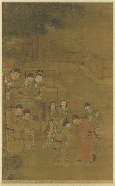 畫五王夜飲,火炬高燒,華宴已闌。一不勝飲而逃,一攬衣衲勸酒,一姬捧水盆侍候。一離席已醉,童子扶掖,二人一立庭間,一挽留,一遜謝。二姬執壺勸酒。男侍持燈籠。畫法清雅。無款印。