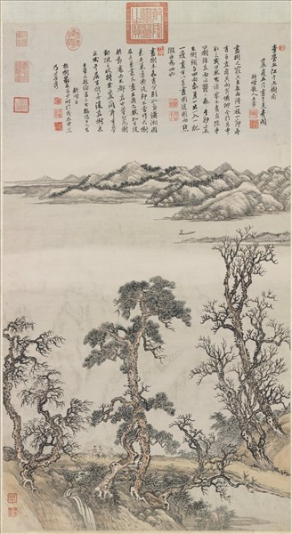 王翬(1632-1717)字石谷,號耕煙散人,又號烏目山人、劍門樵客。江蘇常熟人。善山水,最初從王鑑(1598-1677)學畫,後王鑑引介再從王時敏(1592-1680)遊,並臨摹其家中所蓄之宋元名家巨跡,集其大成。為清初四王中致力於古人最深者,畫筆綿密細緻,尤得力於王蒙為多。江岸七樹,松柏居中,兩側畫枯樹五株,高低偃仰,錯落有致;步騎三人,且語且行於樹隙之間,隔岸作遙浦遠山。全圖色調灰沈,表現出秋意荒率的氣息。本幅佈局一河兩岸出自元人,山石披麻皴則取法董巨,蟹爪枯樹則有李郭遺意,筆法則出於自運。集前人之長,而不為時人流派所拘牽囿限,卓然獨絕,成一代作家。幅上方題識抄錄董其昌畫論二則,第一則的主旨是在探討畫樹幹和佈列樹枝,以及畫樹結頂的訣竅;另一則是闡述李成、董源畫樹之相異處,字簡意遠,深有見地。(許郭璜)