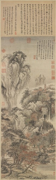 王翬(西元一六三二-一七一七年)。字石谷,號耕煙散人、烏目山人、劍門樵客、清暉主人。少即善畫,繼得王鑑、王時敏指授,並隨之閱覽各地珍藏,藉機揣摩名蹟,因能筆參古今,貌合南北。畫技之精熟為清代第一。 此幀為石谷三十八歲作,其畫中極精之品。畫曾為王時敏、惲壽平所見,兩人皆欲留之,而石谷不與,蓋仿王蒙而深有得者。南田跋中評云:「芟盪陳趨,發揮新意,徊翔放肆,而出山樵幾無餘蘊」。語意極為推獎,而無過當之嫌。